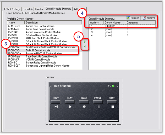 3. Click the Add (Right Arrow) button.  The description of the control module is displayed in the Control Module Summary section and in the IP Link Tree window.