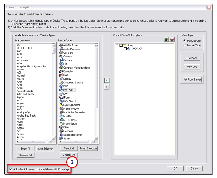 If you select the Auto-check for new subscribed drivers at GC3 startup (2) check box, Global Configurator checks for new revisions of your identified device drivers each time it starts.
