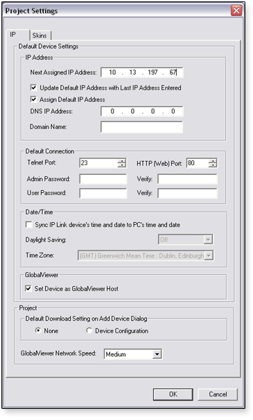 Use the Project Settings screen to set all of the default values for the fields of the Add Device screen (see the Add Device section).  For example, If you enter a default administrator password in the Project Settings screen, it appears in the Admin Password field of the Add Device screen.  If you leave the Default Admin Password field blank in the Project Settings screen, the Admin Password field is also blank when you open the Add Device screen.