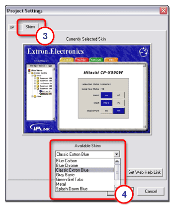 Use the Skins tab (3) and Available Skins drop-down list (4) to select the look and feel of the GlobalViewer interface.