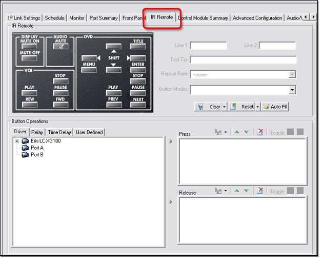 Since you have many choices for the input and output devices connected to your A/V network, the IR 402 remote control DISPLAY, DVD, and VCR buttons are non-functional until you select a device driver for each input and output device and configure the button operations in the IR Remote tab of Global Configurator. These general rules apply to configuring the buttons:
