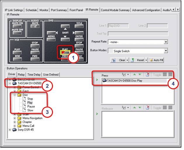 In the example below the Play function is associated with the PLAY button in the DVD device driver. If the IR 402 handheld remote control is pointed at the System 5 IP and the DVD PLAY button is pressed, the DVD player connected to the System 5 IP serial port begins its Play function. Note: All of the DISPLAY, AUDIO, VCR, and DVD button functions must be configured in the IR Remote tab for them to be operational. |