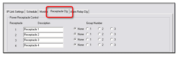 an IPL T PCS4/4i is selected in the IP Link This tab is used to group receptacles together. When grouped together, receptacles can be switched on and off with the same pushbutton switch. For example, if Receptacles 1 and 2 are both placed in Group 1, they will both respond to power on or off commands from either pushbutton switch 1 or 2 on the front panel. |
