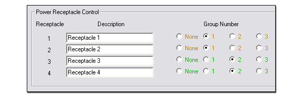 To group receptacles: For each receptacle in the Power Receptacle Control section, click the radio button of the desired group number. Available options include: