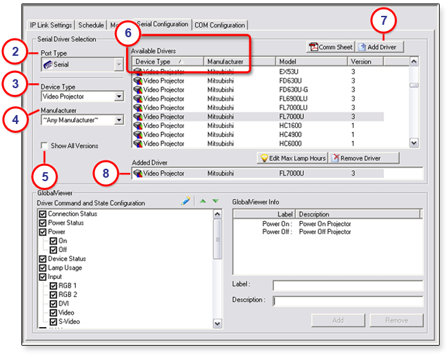 2. The bottom, left section (Driver Command and State Configuration) allows you to configure the control buttons that are displayed in the GlobalViewer® interface for the currently selected device.