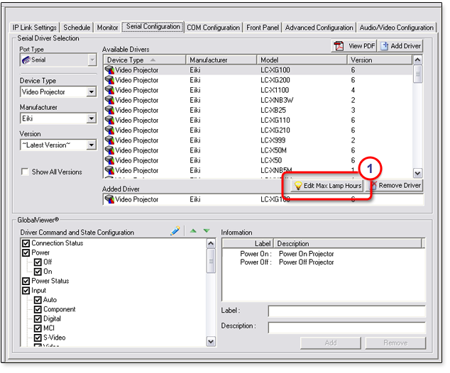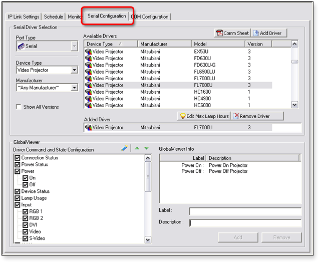 When a device driver is selected as described above, the Driver Command and State Configuration section is populated with the names of control buttons that will be displayed for this device in the GlobalViewer interface.