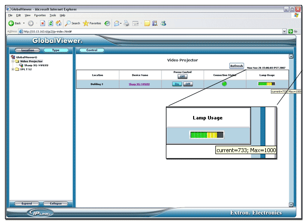 On the GlobalViewer Video Projector Type summary page is a Lamp Usage bar graph indicator.  When a device driver is installed for a video projector, it provides the maximum value to be used by the bar graph (Max=1000 in the example below).
