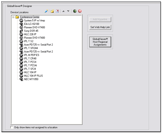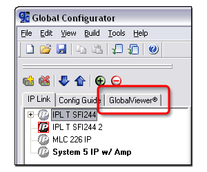 GlobalViewer® Select this tab to display the GlobalViewer Tree (see below). Devices that are copied from the IP Link Tree window to the GlobalViewer Tree section in the Global Configurator window can be viewed and configured using the web-based GlobalViewer interface. See the Overview of GlobalViewer section for more information. |