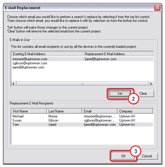 In the example below, all existing e-mail assignments for mmoore@uptownav.com will be directed to tjared@uptownav.com. Note: Be sure to click the Set (2) button prior to clicking OK (3). |