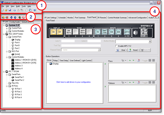 The Global Configurator ScreenThe image below shows a typical Global Configurator screen after several IP Link devices have been added in the IP Link Tree window. The four main areas of the GC screen are the: