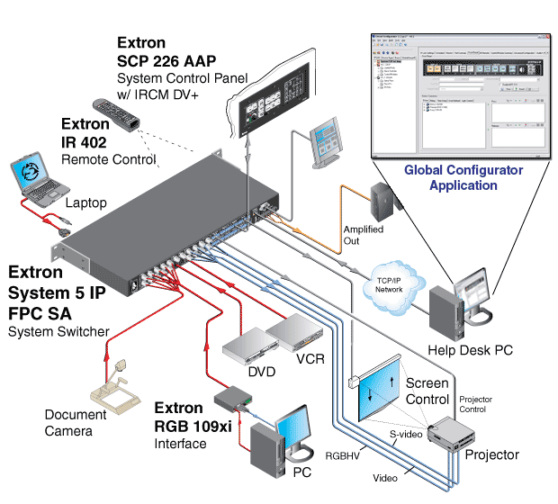 a graphical user interface called GlobalViewer After the configuration file is created, one or more devices on the A/V network can be designated as a GlobalViewer host device. The configuration file is then uploaded to the host device. The GlobalViewer interface can be launched by opening an Internet browser on a local PC and entering the IP address of the host device in the Address field of the browser. In the example network diagram below, the Extron System 5 IP is set up as the GlobalViewer host device. The System 5 IP, SCP 226 AAP Control Panel, IR 402 Remote Control, and all of the A/V input and output devices (document camera, DVD, VCR, video projector, screen, and so on) can be added to the Global Configurator project file. When the configuration file is complete and uploaded to the host device, you can launch the GlobalViewer interface from the host device (System 5 IP) to monitor and control all of the devices on this A/V network. |