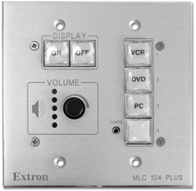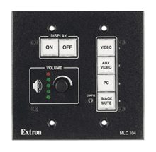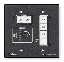 MLC 104 IP PLUSThe Extron MLC 104 IP Plus MediaLink Controller with built-in IP Link Ethernet Control is an easy-to-use control panel for any small classroom or meeting room. It is designed to control a wide range of smaller A/V systems and enables web-based remote diagnostics, asset management, and support. The MLC 104 IP Plus standardizes the control interface for all systems, making display systems simple to use. Standardization also makes setup and maintenance easier to support. The flexible MLC 104 IP Plus acts as an extended remote