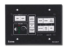 MLC 226 IPThe Extron MLC 226 IP MediaLink Controller is an enhanced control panel for controlling A/V equipment in any classroom or conference room. It standardizes the control interface for all systems, making display systems simple to use. Standardization also makes setup and maintenance easier to support. The MLC 226 IP also includes IP Link with GlobalViewer, a free web-based asset management and remote control software application. The MLC 226 IP MediaLink Controller offers several enhanced control capabilities including six input selection buttons, two bidirectional serial ports for display and switcher control, three unidirectional serial/IR control ports, six relays, and support for optional IRCM - Infrared Control Modules to control VCRs, DVDs, and other IR controllable equipment. The flexible MLC 226 IP acts as an extended remote control