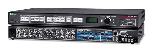 System 5 IPSystem 5 IP with AmplifierThe Extron System 5 IP is a five input, one output integrated A/V active switcher that provides an all-in-one, affordable solution for single projector A/V installations in classrooms, boardrooms, conference rooms, and multimedia environments. It includes such features as configurable inputs, easy-to-use IR learning, customized display control via RS-232, relays for room control, an integrated 40-watt, rms, audio amplifier, and IP Link Ethernet monitoring and control. Universal projector controlThe System 5 IP offers two methods of projector control: RS-232 or IR. The switcher can learn IR signals from remote controls. This enables the switcher to communicate with the display and sources such as VCRs and DVD players. IR learning makes setup and operation simple and customizable. Virtually any RS-232 controllable projector or display device can be used with the System 5 IP. Extron creates and administers a wide selection of commonly used projector control drivers that enable the System 5 IP to control basic projector functions such as power and input selection. Users can create their own drivers or go to the Extron web site to download RS-232 drivers configured for the latest and most popular projectors. In addition, a custom configuration mode is available to allow for user-defined IR or RS-232 commands. Room controlThe System 5 IP also offers room control capability, so that room lighting, screen settings, and other device functions can be controlled through the six internal relays of the switcher. By providing projector control, room control, universal compatibility with displays, and system audio capabilities, the System 5 IP consolidates functions that would typically require up to six different products into one integrated solution. Fixed and variable preamp line level outputsThe System 5 IP provides fixed and variable line level audio outputs on captive screw connectors for use with an external amplifier or self-powered speakers. Fixed audio outputs are especially effective when used with external mixers, amplifiers, and assistive listening devices. Variable audio outputs enable the audio signal levels to be adjusted using the volume control on the switcher. Integrated stereo audio amplifierThe System 5 IP is available with or without an internal 40-watt audio amplifier, 2 x 20 watts rms, to drive 4 or 8 ohm speakers. The unit can also be set for dual mono mode where it sums the left and right input signals together and drives the same mono signal to both the left and right outputs. IP Link Ethernet controlThe System 5 IP is equipped with Extron IP Link technology, an IP integration technology specifically engineered to meet the needs of professional A/V environments from small K-12 classrooms to large universities and businesses. IP Link provides these advantages:
