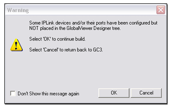 WarningIf you added a device, but have not assigned that device to a location in the GlobalViewer Tree window, you are prompted by a Warning dialog when you attempt to build a configuration file. |