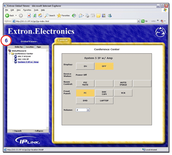 Before a configuration file is active in the GlobalViewer® interface, the GC file must be built and uploaded to a GlobalViewer host device on the AV network. The build process compiles all of the configuration data (such as port assignments, device locations, and schedules) you entered into the GC file for each device on the AV network. The upload process delivers the built (compiled) file to the GlobalViewer host device. After the compiled GC file has been uploaded to a host device, you can launch the GlobalViewer interface by entering the IP address of the host device in the Address field of an Internet browser. |