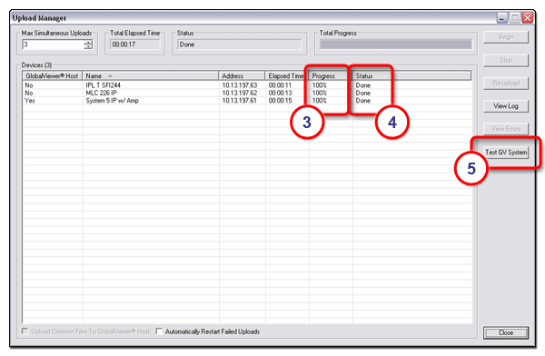 Upload completeWhen the upload is complete, the Progress (3) and Status (4) fields are updated to indicate completion. Click the Test GV System button (5) to view the GlobalViewer host interface (6). |