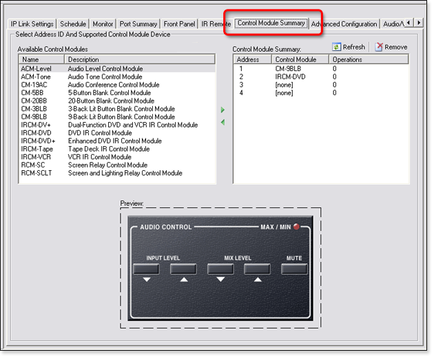 A Control Module is a plate with buttons that can be associated with a System 5 IP, mounted into an MLC 226 or MLC 104 IP Plus, or mounted into a wall, podium, desk, or rack. The buttons on a Control Module can be configured to perform specific device operations, such as power on a device, raise and lower audio volume, and so on. The Control Module Summary tab is used to configure the button operations of a Control Module. |