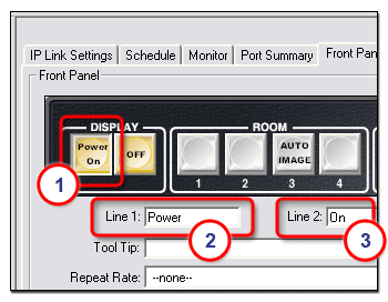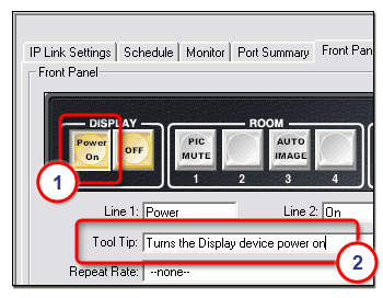Setting a Button Repeat RateThe repeat rate is the rate at which a button repeats its function if the button is held down. ExampleIf you have configured a button as an increment volume button and given it a repeat rate of 1.00 second, as long as you keep this button pressed (the front panel button or the GlobalViewer button), the Increment Volume command is sent every 1.00 second. To set a repeat rate: