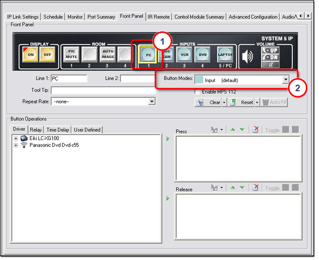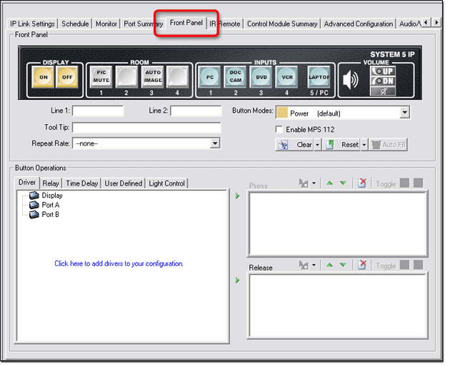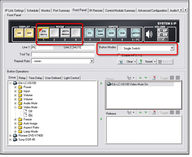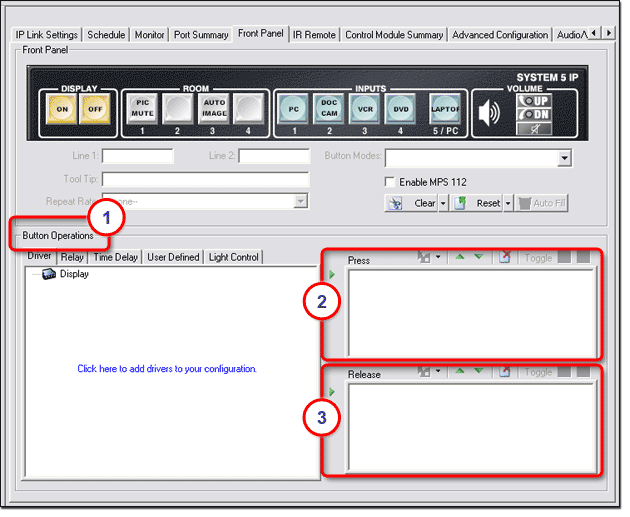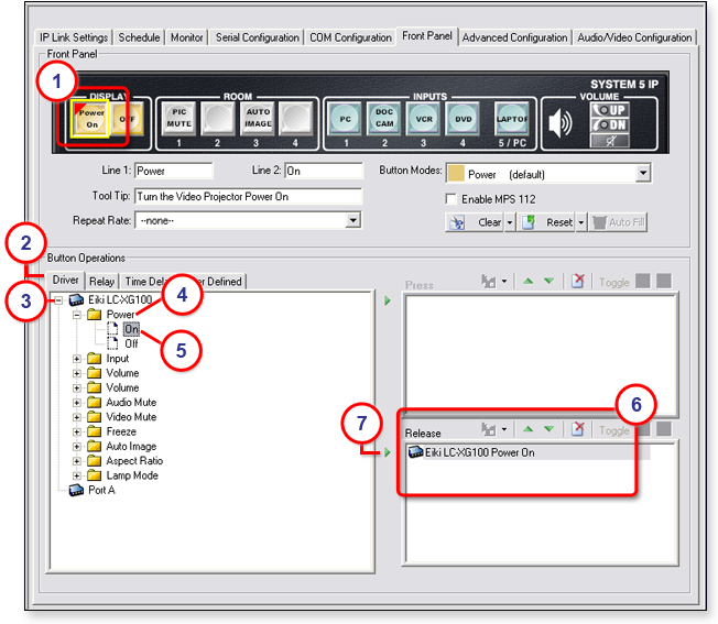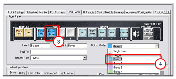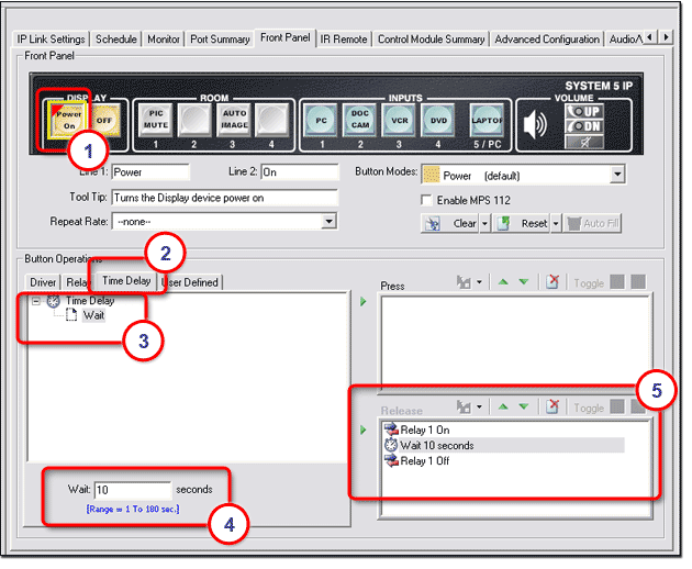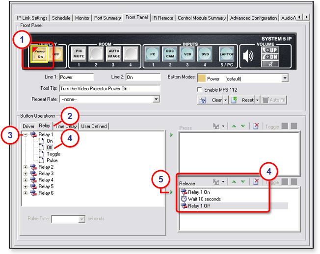 RelayThe Relay tab in the Button Operations section gives you the ability to add relay functions to a selected button. ExampleIf you want to power on a projector and lower a projector screen all with one press or release of the Display Power On button, you can: