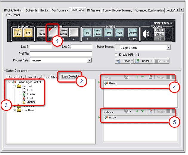 Note: In the example below, a solid green indicator is assigned to the button when pressed. A solid amber indicator is assigned to the button when released. These indicators appear on the actual device button and in the GlobalViewer graphical representation of the button. |