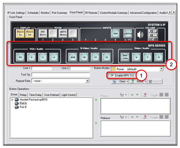 Enable MPS 112The Enable MPS 112 check box enables you to add the MPS 112 Media Presentation Switcher control panel to a System 5 IP control panel and configure all of the MPS 112 buttons along with the System 5 IP buttons. The Extron MPS 112 Media Presentation Switcher merges four independent switchers in a single enclosure: