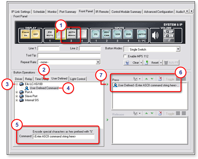 - or - Click one of the two Right Arrows (7) to move the user-defined command to the respective Press or Release section. |